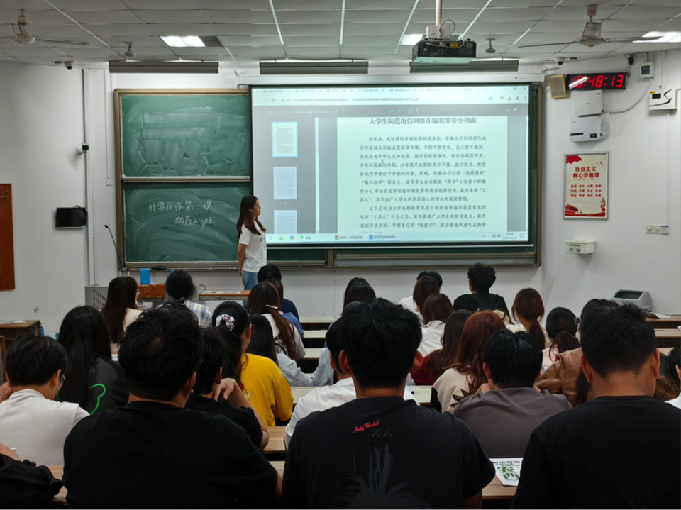 针对高校环境中常见的诈骗类型,本次活动重点聚焦了几类高发电信网络诈骗形式。结合大学生群体特点,学院着重讲解了冒充熟人、冒充客服、校园贷、网上游戏账号虚假交易和网上兼职刷单等诈骗手段。在主题班会讨论中,各班还结合真实案例分析了诈骗分子的作案手法和心理操纵技巧。通过这些分析,学生们学会了识别诈骗行为的关键特征,掌握了“不轻信、不透露、不转账”的防范原则。学院特别强调了下载使用“国家反诈中心”APP的重要性,指导学生接听96110来电或查看12381短信内容,充分利用技术手段增强自身防范能力。